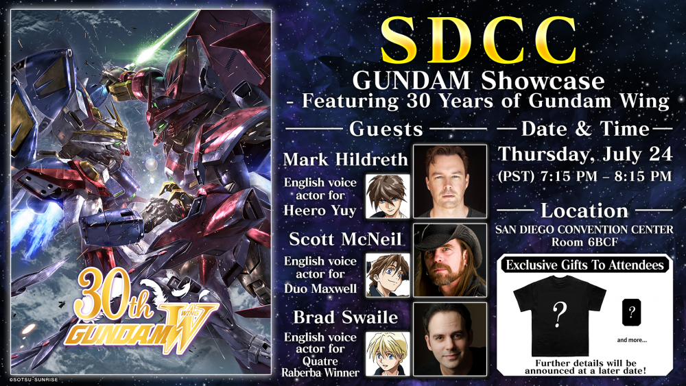 Commemorating the 30th anniversary of Mobile Suit Gundam Wing, a special panel titled “GUNDAM Showcase – Featuring 30 Years of Gundam Wing” will be held at SDCC. Fans are invited to attend for the latest updates on the Mobile Suit Gundam Wing 30th Anniversary project and other Gundam-related news. Guest speakers of the panel will also respond to fan questions during a Q&A segment.