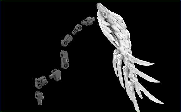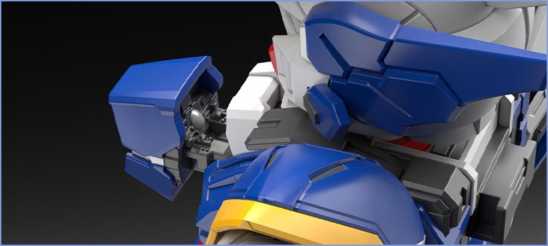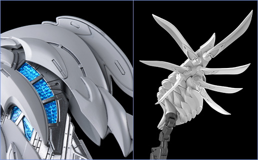 The main wings have five-layer structures with individually moving parts, resulting in a massive appearance. The wings can also be unfolded to reveal internal silver parts and clear parts with a Reflection Cut finish. This kit pursues to create immense wings while maintaining detailed textures.