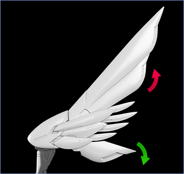 The secondary wings have unfolding gimmicks where the lower feathers unfold when the upper feathers are raised.