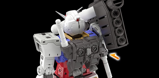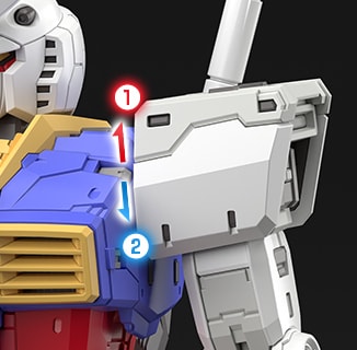 The upper connection hole enables for connection to Action Base even with the armament mounted on the waist. The cover on the waist can also function as an armament mount in itself, allowing the Hyper Bazooka to be fixed. The shield can be carried by utilizing the shape of the gray part in the center of the back pack.