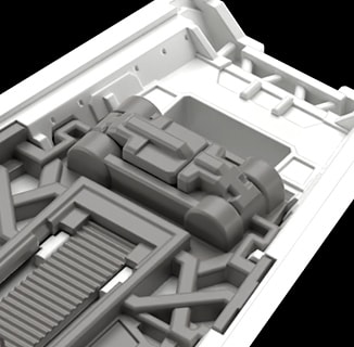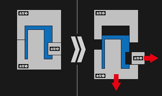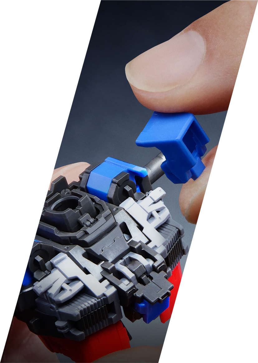 Ordinary plastic model kits are formed by injecting resin into the cavity of a two-part mold with three-dimensional etchings on top and bottom. During that process, neither top nor bottom can be shifted to allow for further details or holes, but sliding molding solves that problem by enabling one or more additional molds (in the form of slides) to be moved in and out of the cavity. Depending on their usage, these slides make it possible to create integrated cylindrical parts without any need for partitioning. This enables more detailed parts and shortens the eventual assembly process.