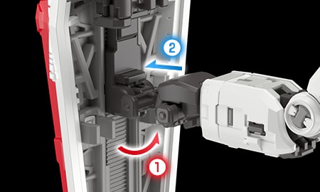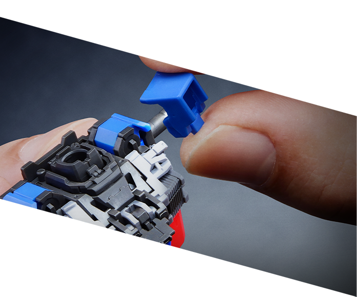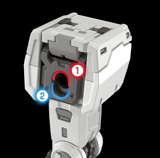 There are a total of three connector holes on the backpack and waist for armaments and Action Bases. Each hole can be concealed with movable cover parts without impairing the Mobile Suit’s design.