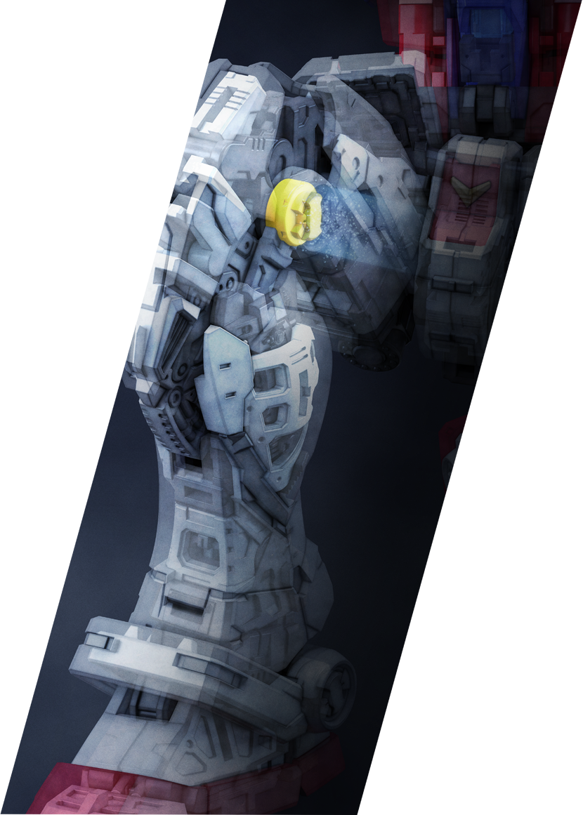 When interpreting Mobile Suits as actual machines and weapons, their moving parts must be protected by armor at all times and require precise structures that enable the exterior armor parts to move in conjunction with the frame.