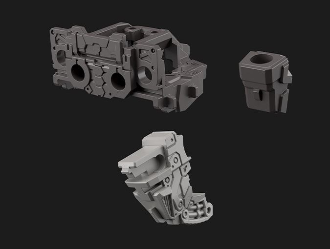 The tiny indentations in the ducts and armor carry a glimpse of gray that evokes the existence of internal devices. This results in more visual information and an expressive sculptural quality that feels more like a complex machine than ever.