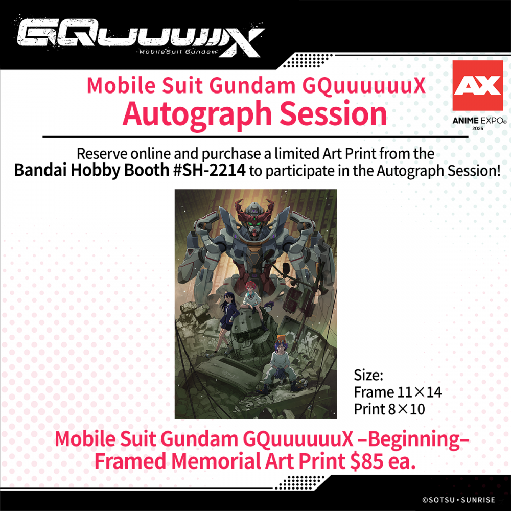 2.Show your reservation QR code and purchase the “Mobile Suit Gundam GQuuuuuuX –Beginning– Framed Memorial Art Print” ($85) from the Bandai Hobby Booth #SH-2214 before the Autograph Session. An entry ticket will be given upon purchase.