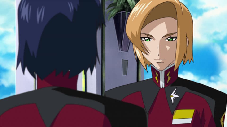 After their meeting with Chairman Dullindal, the Minerva pilots are treated to a day of vacation and given rooms in one of Diocuia's hotels, and Athrun receives an unexpected guest. The pilots also make the acquaintance of Heine Westenfluss, a FAITH member who has been assigned to the Minerva as an additional pilot.