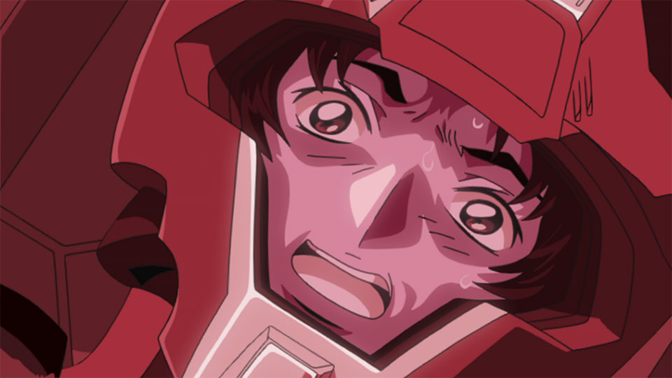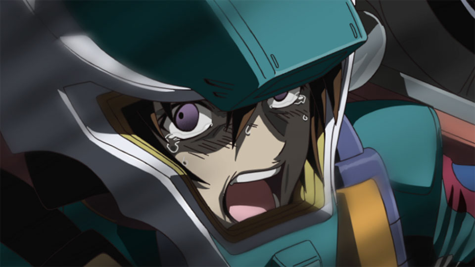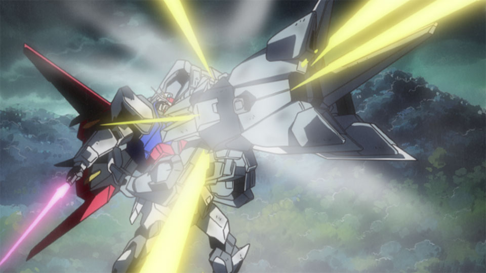 Kira cries out and slices off the Aegis Gundam’s right arm. But Athrun captures Strike Gundam and then sets the Aegis to self-destruct. Strike Gundam and Aegis Gundam explode with a deafening roar, Kira remaining inside the cockpit…